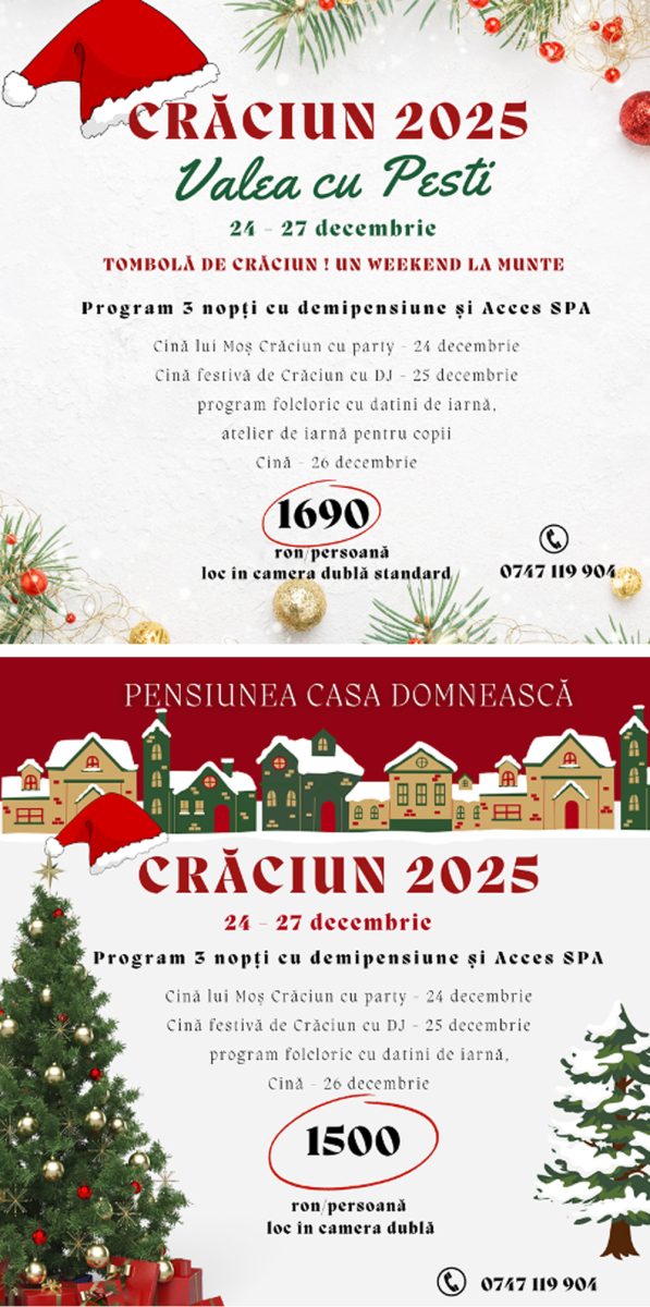 - Oferta specială de Crăciun include — pentru cei care optează — cina de Ajun, brunch tradițional și cina festivă de Crăciun. Există opțiuni cu pensiune completă sau cu masă selectivă.