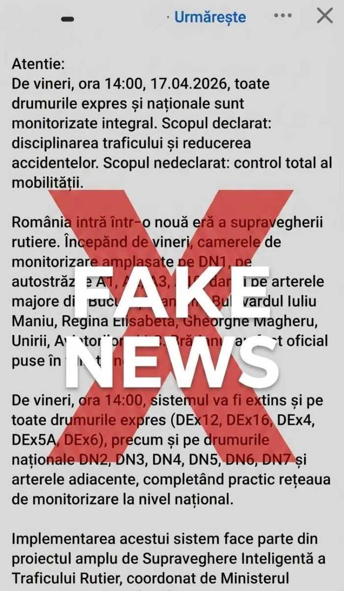 În ultimele ore, pe rețelele de socializare și pe platformele de mesagerie (WhatsApp), circulă un mesaj alarmist cu privire la o „monitorizare integrală” a drumurilor naționale și a arterelor principale din București, începând cu data de 17.04.2026. Vă informăm oficial: ACEST MESAJ ESTE FALS!, transmite Poliția.
