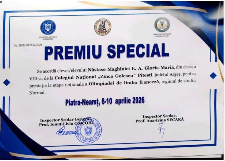 Gloria Maria Năstase Maghinici, elevă în clasa a VIII-a la Colegiul Național Zinca Golescu, a obținut Premiul Special la etapa națională a Olimpiadei de Limba Franceză, desfășurată la Piatra-Neamț în perioada 6–10 aprilie 2026.