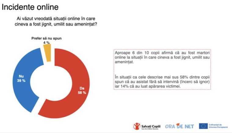 Amenințările, jignirile se petrec și în mediul virtual. Fenomenul de cyberbullying a fost studiat de ONG-ul Salvații Copiii România și, potrivit unui studiu publicat săptămâna trecută, șase din zece copii participanți la sondaj au fost martori ai hărțuirii online, aproape jumătate au fost contactați de persoane necunoscute, iar expunerea la conținut violent, pariuri, substanțe interzise și provocări periculoase a devenit o experiență frecventă în viața lor digitală.