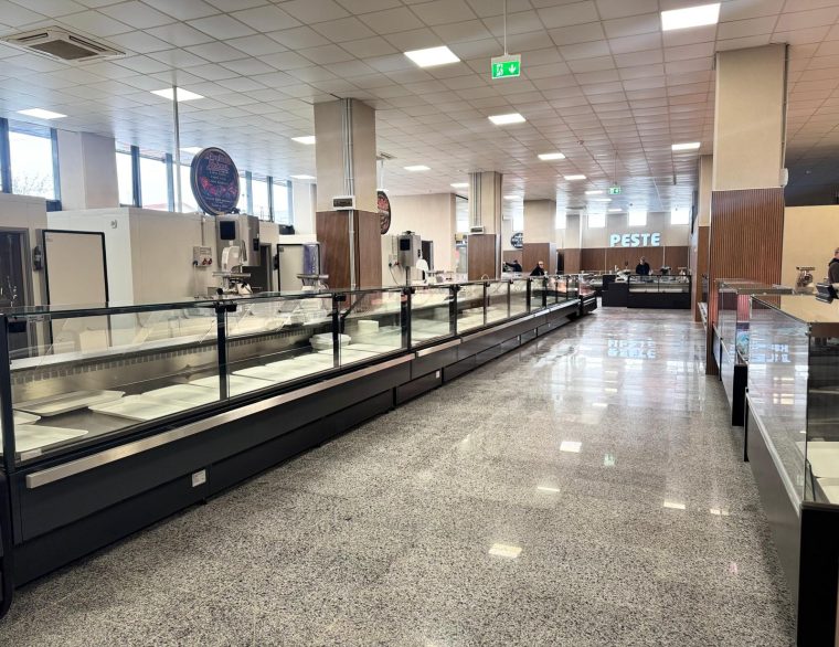 Practic, hala este complet reconfigurată, dotată cu vitrine frigorifice moderne, din inox, integrate într-un ansamblu coerent, spații de lucru curate și bine delimitate, camere frigorifice și zone tehnice optimizate, precum și finisaje durabile, adaptate utilizării intense.