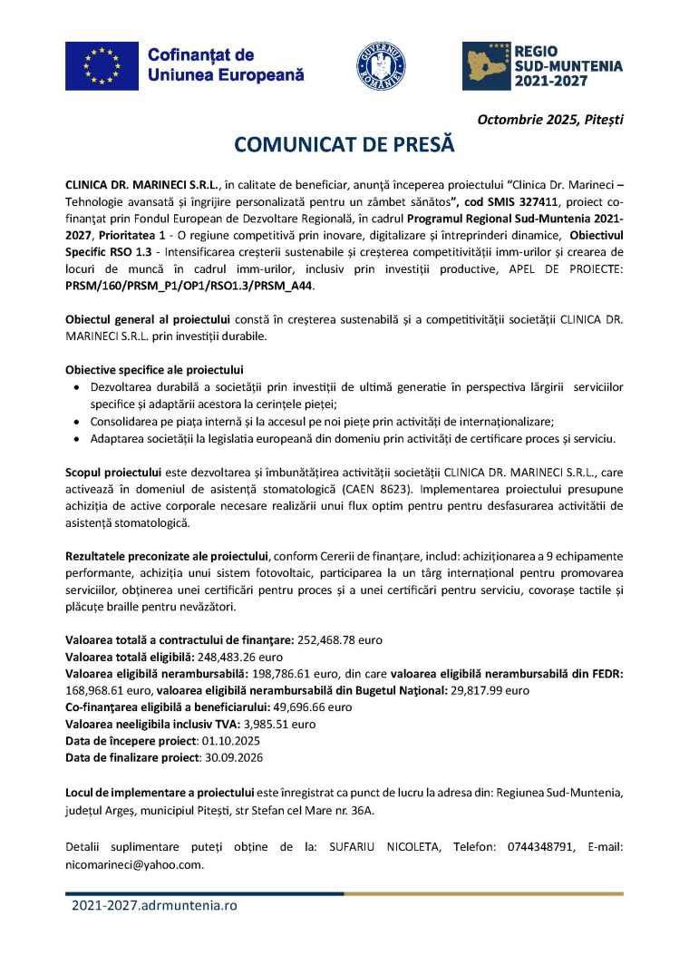 CLINICA DR. MARINECI S.R.L., în calitate de beneficiar, anunţă începerea proiectului “Clinica Dr. Marineci – Tehnologie avansată și îngrijire personalizată pentru un zâmbet sănătos”, cod SMIS 327411, proiect cofinanţat prin Fondul European de Dezvoltare Regională, în cadrul Programul Regional Sud-Muntenia 2021- 2027, Prioritatea 1 – O regiune competitivă prin inovare, digitalizare și întreprinderi dinamice, Obiectivul Specific RSO 1.3 – Intensificarea creșterii sustenabile și creșterea competitivității imm-urilor și crearea de locuri de muncă în cadrul imm-urilor, inclusiv prin investiții productive, APEL DE PROIECTE: PRSM/160/PRSM_P1/OP1/RSO1.3/PRSM_A44.