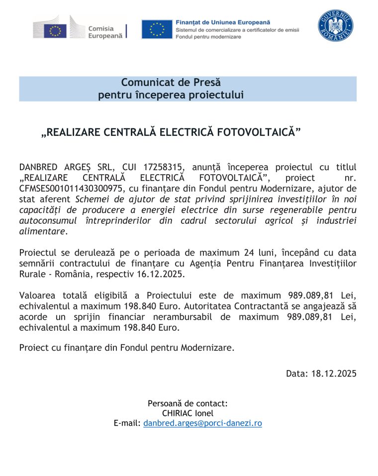 DANBRED ARGEȘ SRL, CUI 17258315, anunță începerea proiectul cu titlul „REALIZARE CENTRALĂ ELECTRICĂ FOTOVOLTAICĂ”, proiect nr. CFMSES001011430300975, cu finanțare din Fondul pentru Modernizare, ajutor de stat aferent Schemei de ajutor de stat privind sprijinirea investițiilor în noi capacități de producere a energiei electrice din surse regenerabile pentru autoconsumul întreprinderilor din cadrul sectorului agricol şi industriei alimentare.