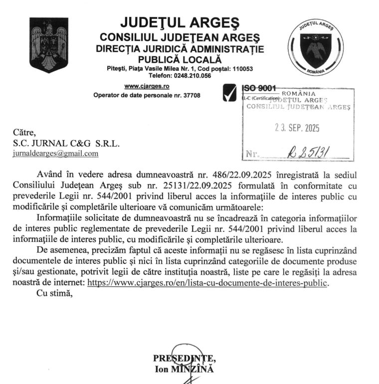 „Având în vedere adresa dv. nr. 486/22.09.2025, înregistrată la sediul Consiliului Județean Argeș sub nr. 25131/22.09.2025, formulată în conformitate cu prevederile Legii 544/2001 privind liberul acces la informațiile de interes public, cu modificările și completările ulterioare, vă comunicăm următoarele: