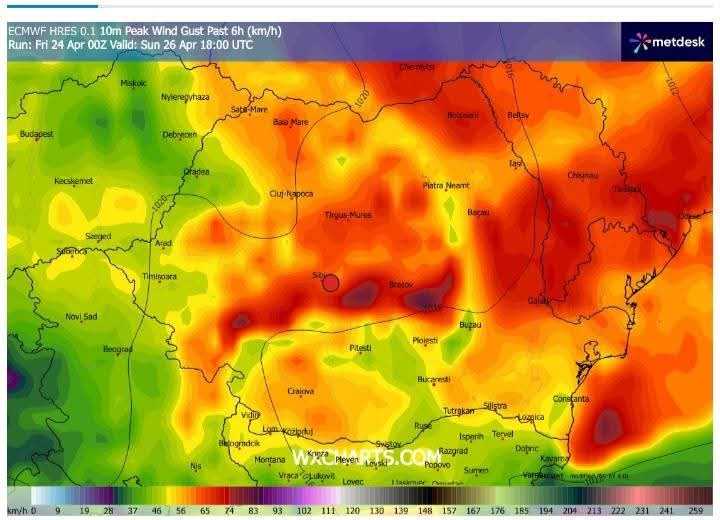 Viteze maxime: Modelele indică rafale ce pot atinge 110 – 123 km/h pe crestele montane și în zonele de relief accidentat din Carpații Meridionali (zona Sibiu – Brașov).
