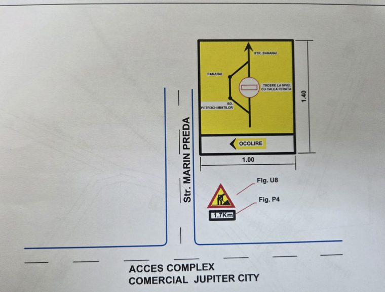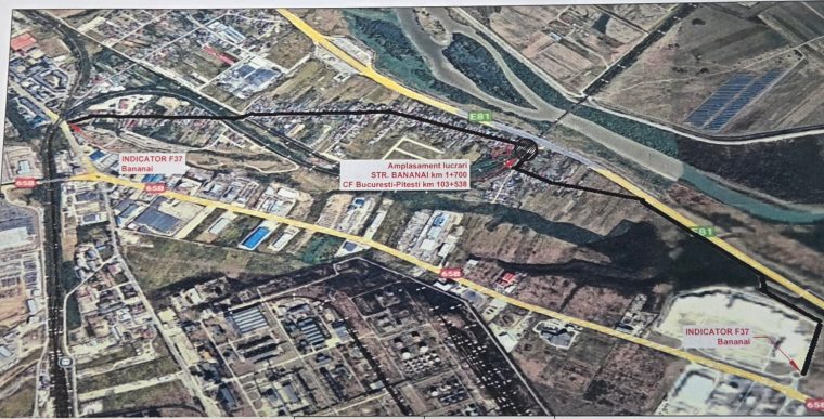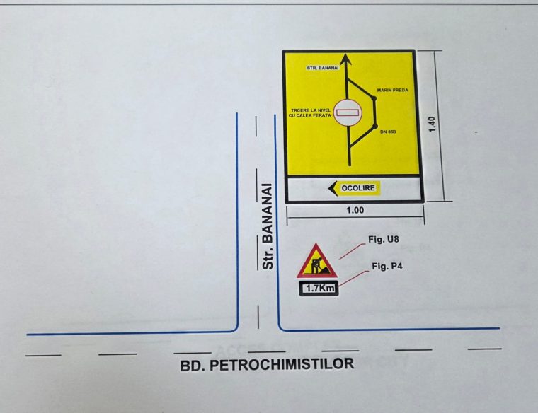 Potrivit sursei citate, traficul rutier va fi deviat de pe strada Bănănăi, din zona trecerii la nivel cu calea ferată de la km 103+538, pentru riverani, spre bulevardul Petrochimiștilor și pe strada Marin Preda, către accesul la complexul comercial Jupiter City și DN 65B, conform schiței de mai jos.