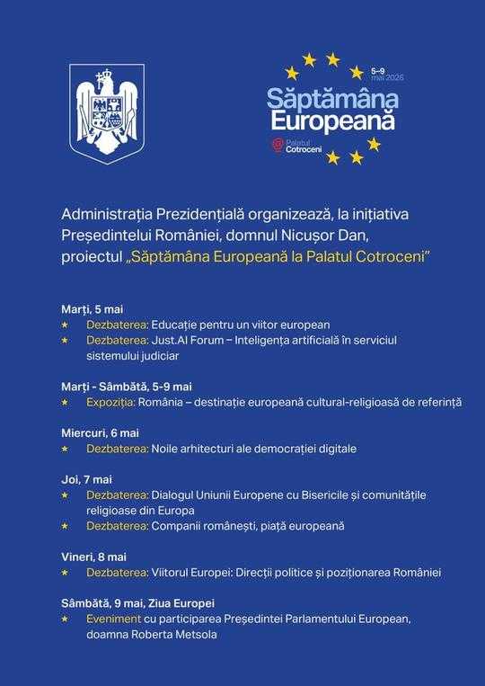 Evenimentul se va încheia în data de 9 mai, de Ziua Europei, cu o manifestare la care va participa preşedintelui Parlamentului European, Roberta Metsola.
