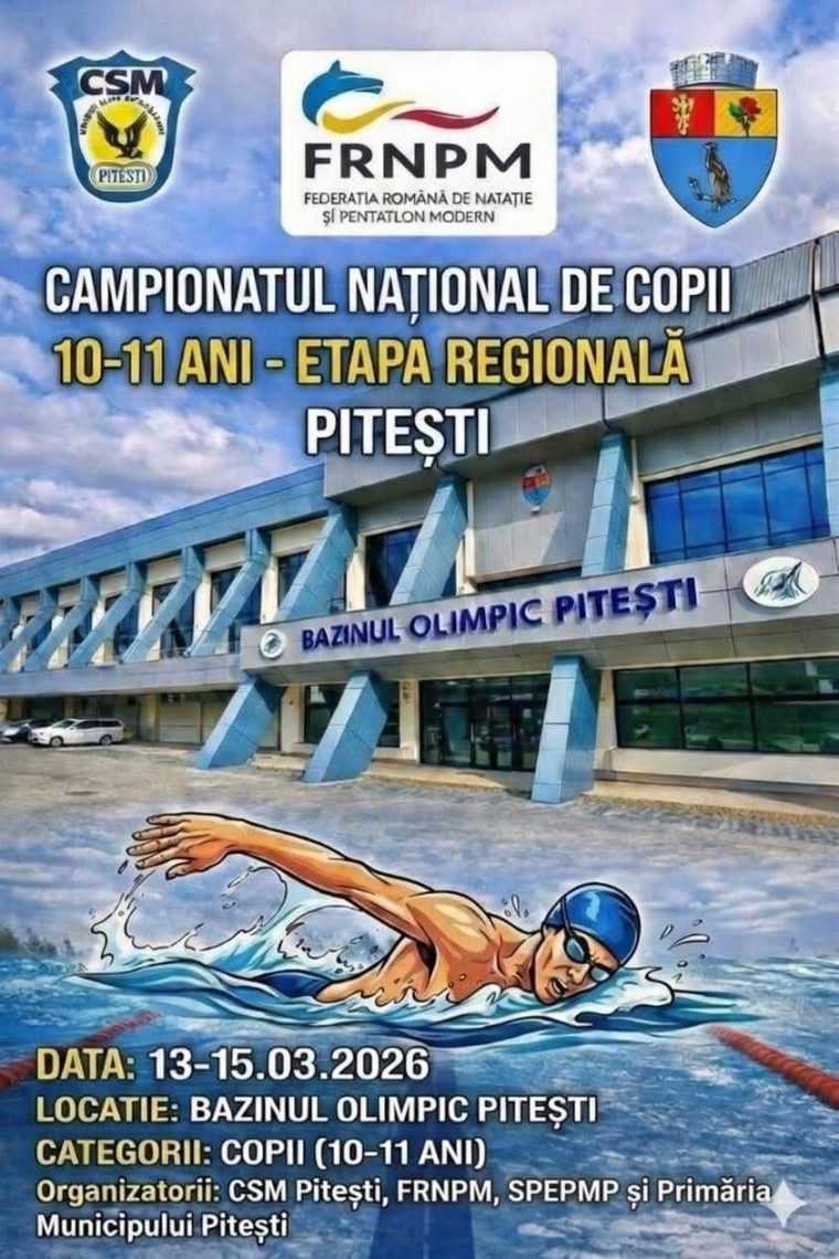 În perioada 13–15 martie 2026, Bazinul Olimpic Pitești găzduiește Campionatul Național de Copii (10–11 ani) – Etapa Regională. Tineri înotători din mai multe orașe vor concura pentru calificarea la Campionatele Naționale din această vară.