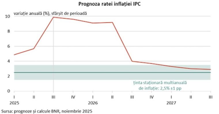 Prognoza BNR prefigura încă din vară aceste vârfuri ale inflației, cu riscurile aferente, în special pe termen scurt. În ciuda acestor presiuni inflaționiste, Consiliul de administrație al BNR a decis în 2025, în ședințele din 8 august, 8 octombrie și, recent, în 12 noiembrie, menținerea ratei dobânzii de politică monetară la nivelul de 6,5%. La acest nivel a fost redusă dobânda de referință în 2024, de la 7% anterior, în condițiile în care inflația intrase, la jumătatea anului 2024, pe un ușor trend de descreștere, însă doar temporar, așa cum aveam să observăm peste doar câteva luni.
