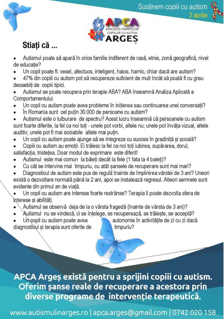 Asociația Părinților Copiilor cu Autism Argeș – APCA marchează și în acest an Ziua Internațională de Conștientizare a Autismului, o zi dedicată înțelegerii, acceptării și susținerii persoanelor cu autism și a familiilor acestora. Cu acest prilej, clădirea Primăriei Pitești va fi iluminată în albastru. În această zi, APCA Argeș împlinește 15 ani de la înființare.